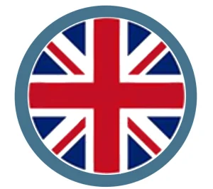 Stylised circular Union Jack (red, white and blue) centred inside a muted teal-blue circular border.
