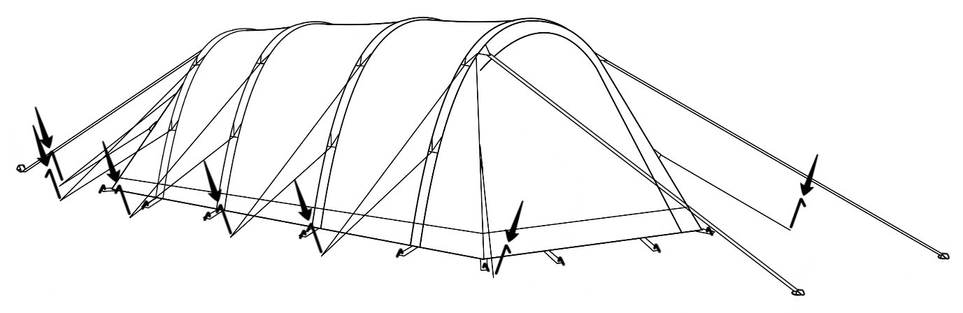 Once the tent has taken shape close all of the entrances so that the tent can be tensioned correctly. At this stage you may need to reposition the corner pegs to ensure that the groundsheet is taut and that the sides are all in line. Now fully extend out the main end webbing guy tapes and add 5 to 6 twists to each (this helps reduce wind noise) before pegging them out properly using the larger V pegs supplied. Now add some tension to the tapes to pull the outer tent fabric taut. Top Tip – Don’t over tension the tapes as this will pull the roof height down.
