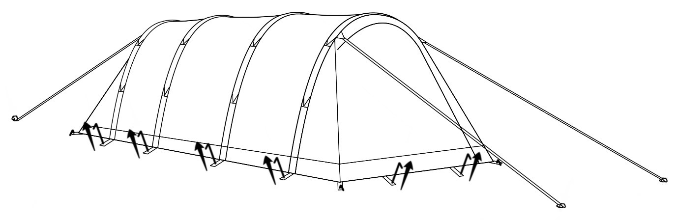 Continue inflating the remaining poles until all are inflated. You may well need to go inside the tent to push the poles upward for the tent to take shape but once you have done this make sure you close all of the outer valve caps to prevent accidental deflation and also air leakage. Top Tip – You may need to pull gently on and then peg out the main end guy tapes temporarily to keep the tent upright during the pitching process.