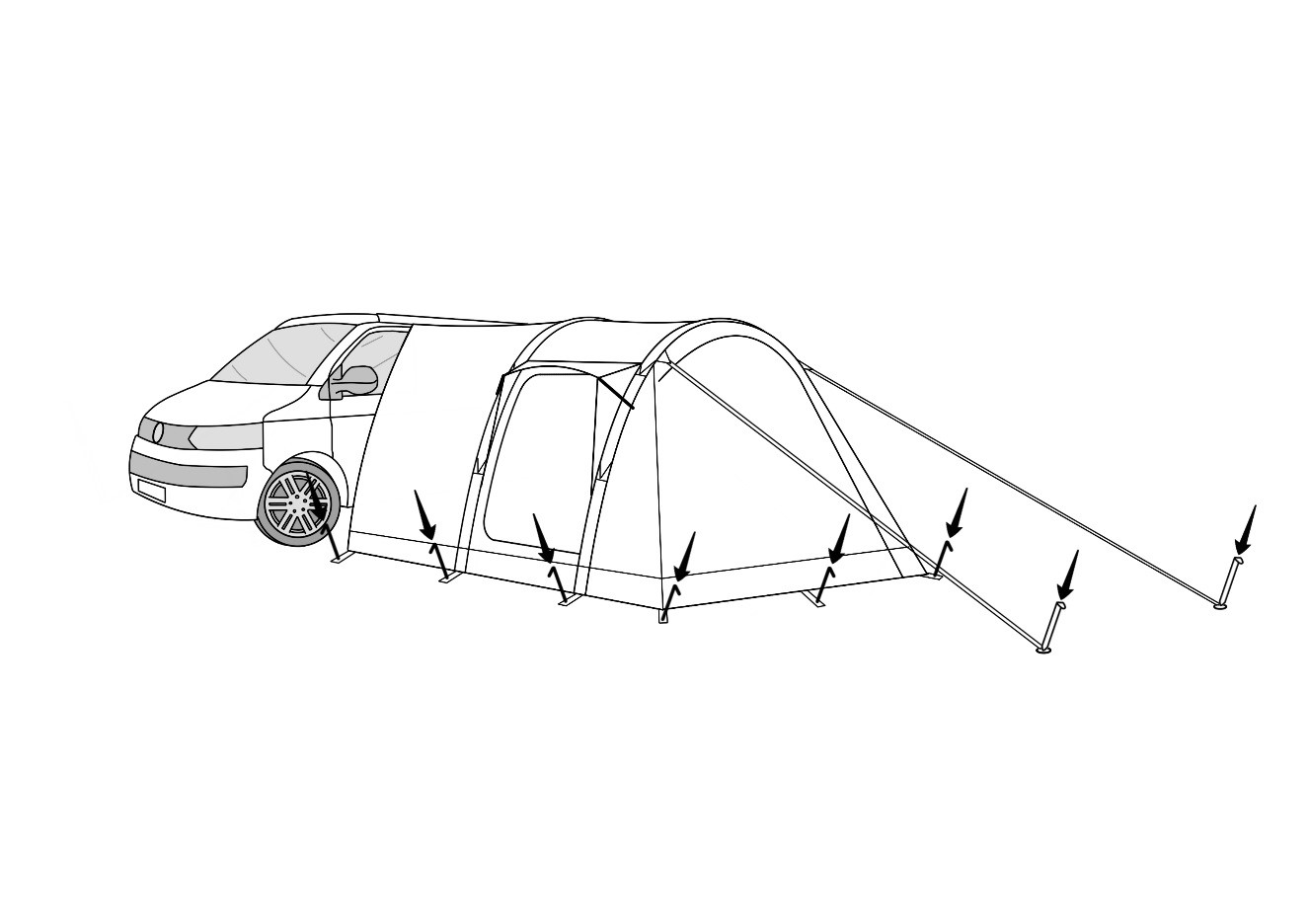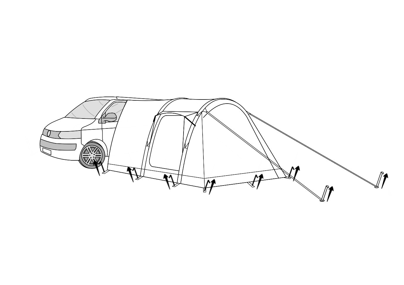 Top Tip – We would recommend using a footprint groundsheet (available separately) as extra protection from dirt and damage for the built in groundsheet. If you have one of these first lay it down on your prepared area and peg out each corner to hold it in place (keep in mind the advice on wind direction). Then un-roll the awning on top (if not simply un-roll the awning over the prepared area) ensuring the groundsheet is on the bottom. Now connect the rear end of the awning to your camper van using either the guy lines provided or your chosen connection system. Please note the awning has both 6mm and 4mm Kador strip sewn in but does not come supplied with a drive away kit.