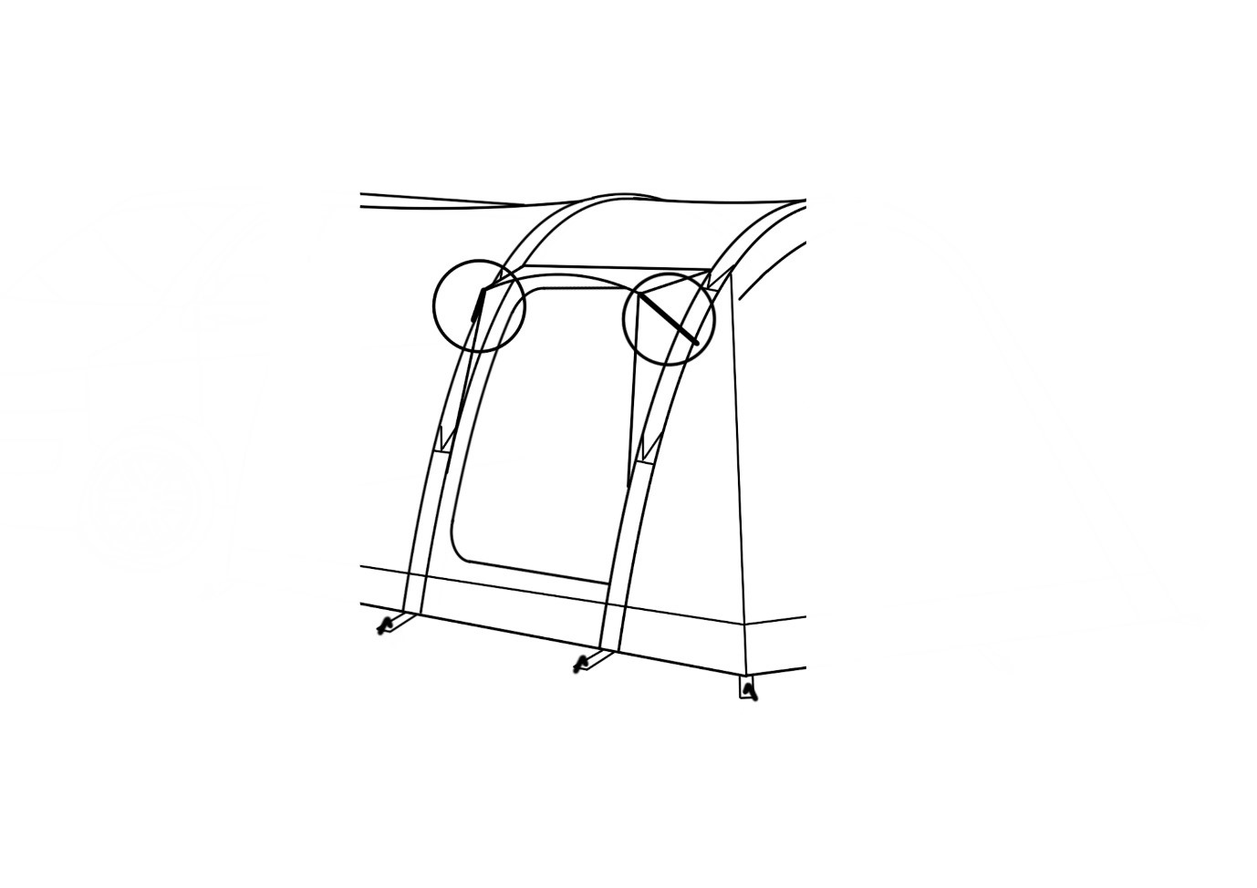 Once the awning has taken shape close all of the entrances so that the awning can be tensioned correctly. At this stage you may need to reposition the corner pegs to ensure that the groundsheet is taut and that the sides are all in line. Now fully extend out the main end webbing guy tapes and add 5 to 6 twists to each (this helps reduce wind noise) before pegging them out properly using the larger V pegs supplied. Now add some tension to the tapes to pull the outer tent fabric taut. Top Tip – Don’t over tension the tapes as this will pull the roof height down.